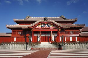 日本家屋の瓦屋根と違い、瓦と瓦の間に漆喰をこんもりと盛る。瓦の赤と漆喰の白、それらが織りなす縞。これこそが首里城の大きな特徴だ。