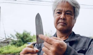 田端さん。ハンマーの打音で赤瓦の品質を見極める(撮影:当銘寿夫)