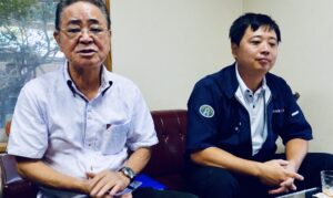 島袋瓦工場の専務・島袋拓真さん(右)。左は代表の島袋義一さん(撮影:当銘寿夫)