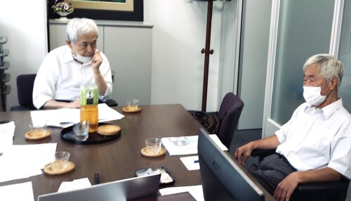 横山篤夫さん(左)。金さんから詳しく空襲体験を聞く