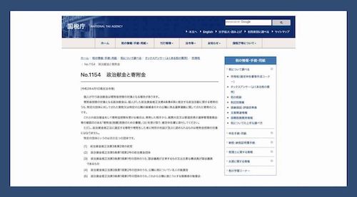 国税庁HPのタックスアンサー。「政治献金と寄附金」はNo.1154で説明されている